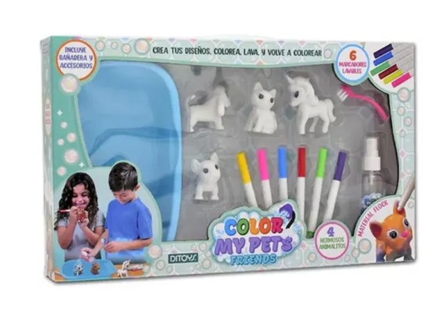 El Color My Pets Bath Time Set incluye 4 adorables dinosaurios que los niños pueden colorear una y otra vez. Luego, colocalos en la bañera con duchador, ¡lavalos y empezá de nuevo! Ideal para fomentar la creatividad y la diversión repetitiva.