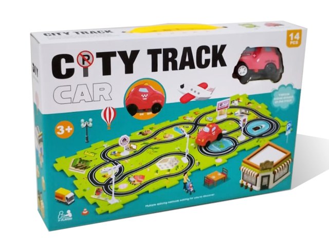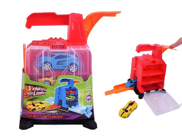Pista de estacionamiento con autos y accesorios color rojo A